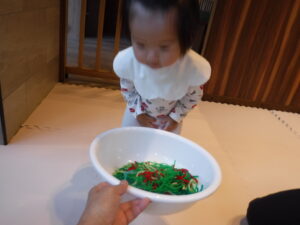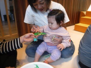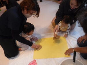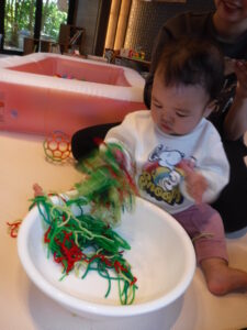 触ったり、こぼしたり思い思いに遊んでから