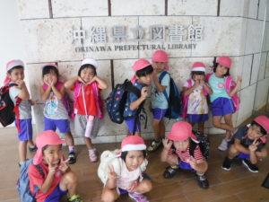 8月16日らいおん組さんはモノレールに乗って「沖縄県立図書館」に行ってきました。駅までの道のりはとても暑くて、汗びっしょりになりましたが、モノレールを見ると元気100%になり、一人ずつ切符を持って乗車し、大興奮のらいおん…