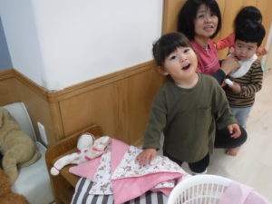 1歳児りす組さんの大好きな遊びは「おままごと」です。飲み物の入ったペットボトルをいくつもトレーに入れて、「よいしょ」と運ぼうとしています。「かんぱーい!」ままごとの遊びコーナーに、子ども達が今興味を持っているいろいろな遊…