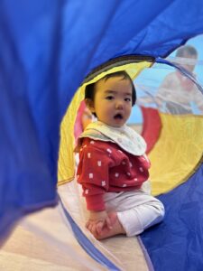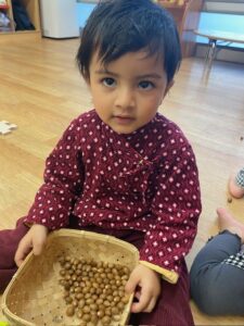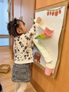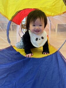 十一月の様子 2025/12/12 こりすの部屋の子ども達はトンネルをして遊びました。手足の力が強くなり、ハイハイで移動する距離が増えてきました。トンネルのゴールで待つ保育者の元まで進み、呼び掛けに笑顔で応じる姿が可愛いですね。 りすの部屋の子ども達はお散歩をした際にたくさんのどんぐりを拾ってきました。集めたどんぐりで遊べるようにどんぐりコースターを用意すると、小さな手でどんぐりを掴んで転がすとコロコロ落ちる様子が楽しく、繰り返し遊んでいました。