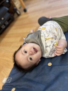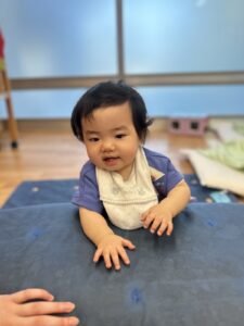 こりすのへやの子どもたちはマットを使って遊びました。動きが活発になり、たくさん寝返りをしたり、ハイハイやずりばいをする姿が増えました。手足の力が強くなったこともあり、マットの山などの段差のある所も手足を動かして登り降りを楽しんでいます。