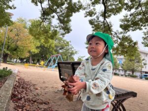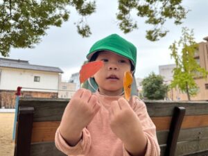 うさぎのへやの子どもたちは公園に行くと落ち葉探しに夢中です。「黄色い葉っぱあったよ!」「この葉っぱ大きい!」と自分たちで落ち葉の色や形に気付き、保育者に話してくれます。集めた落ち葉を雨のように降らしたり、時には破いて音を聞いたりしながら秋の自然に触れる事を楽しんでいました。