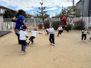 こりすさん、りすさん、うさぎさん(0・1・2歳児) 0・1歳児クラスは、鬼の袋にカラーボールを入れるゲームをしました。保育者と一緒に「えいっ」とボールを入れたり、鬼の風船をぽんぽんと叩いたりしながら、にこにこ笑顔で楽しむ…