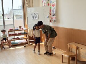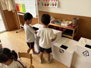 廃材集めをしていると一人の園児が廃材にかかれているマークに関心を持ったところからクラス全体でマーク探しが始まりました。そこから、らいおんの部屋ではマークについて調べはじめ、マークごとに分けられるごみ箱を作って実際に分別してみる取り組みを始めました。「なぜ分別をするのだろう」という保育者の問いかけから子どもたちは、話し合い考えを深めていっています。子どもたちの気付きを大切に楽しみながら学びに繋げていきたいと思います。