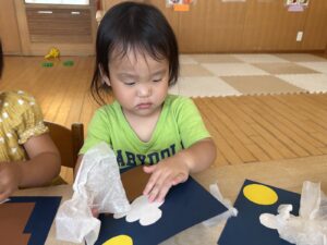 りすさんでは、お花紙をクルクル丸めてお団子を作りぺたぺた貼りました! 丸める時の感触やクシャクシャとなる音を楽しみながらお団子を作りました。1歳児ながらも「だんご!」や「つきみ!」と楽しそうに言いながら作る姿や完成すると嬉しそうに色んな保育者に見せてくれる可愛い姿も見られました!