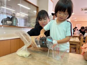 7月26日にきりんのへやとらいおんのへやの参観がありました。きりんのへやでは、スライム作りに挑戦しました。「お父さんお母さんがみてるな」「自分で作れるかな」とドキドキしながら、先生に言われた材料を持ってきて、説明を聞きな…
