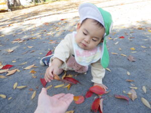 11月 戸外遊び(0歳児) 2025/11/26 第四公園に遊びに行きました。木々が色付き風でひらひらと舞う葉っぱにくぎ付けの子どもたち。赤や黄色、オレンジ色など様々な色の葉を手に取り「みてー」と目を輝かせながら持って来てくれました。落ち葉の上を何度も歩き、踏んだ時の音や感触を確かめてはケラケラと笑う姿がありました。これからも自然物に触れながら楽しんでいきたいと思います。