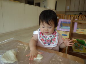 戸外の気温が高い日には、園内散歩に出かけたり、室内で感触遊びを楽しんだりしています。先日、小麦粉粘土で遊びました。初めての小麦粉粘土に興味津々なでした。“何だろう?”と不思議そうな表情をしつつも指で“ちょん“と触ってみたり、ダイナミックに両手で握ってみたり、匂いをかいでみる姿も見られました。これからも様々な感触を楽しんでいきたいと思います。
