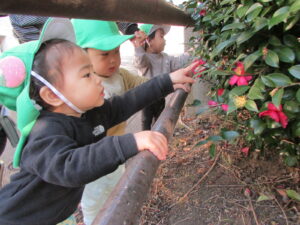 1月 散歩(0歳児) 2026/01/28 子どもたちの大好きなお散歩。「お散歩行こう」の声掛けでいつも出入りする園庭の門の前に進んで集まってきます。保育士や友だちと手を繋いで歩いたり、立ち乗りバギーに乗ったりしていざ出発!道中は花や木の葉に触ったり石や木の実などを拾ったり、鳥や飛行機の音に気付いて「ばいばーい」と手を振ったり…自然に触れたり様々な発見をしたりしながら楽しんでいます。