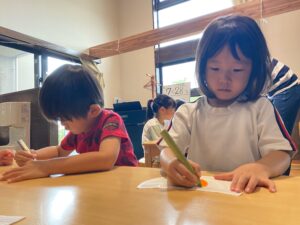 のりの上から折り紙を貼るのは、ぱんだ(3歳児)🐼きりん(4歳児)🦒の友だちと