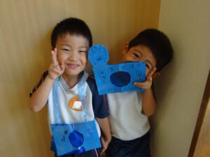 きりんのへや(4歳児)の子どもたちは、日々、多くの製作物を作って楽しんでいます。リボン・毛糸・様々なテープ(セロハンテープ・ガムテープ等)、多くの素材を使ってイメージを膨らませ、楽しむ姿が見られます。この日はカメラを作り、園内を散歩しました。カラーセロファンに興味を示し、レンズの所に貼って、カメラを覗いてみると、普段見ている景色が違って見え、作って遊ぶことの楽しさを友だちと感じる子どもたちでした。今後も表現する力を育み、発見を楽しんでいきたいと思います。