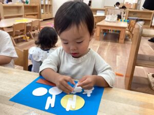りすのへや(1歳児)では、お月見の製作をしました。まん丸の団子やうさぎ、綺麗な満月を台紙に貼って、自分だけの夜空を作りました。団子を重ねてみたり、うさぎを満月の上に乗せてみたりと、一人ひとりが思い思いに表現を楽しむ姿がありました。以前よりも、シールを剥がしたり貼ったりする指先の動きがしっかりとしてきており、イメージを形にしようとする姿に成長を感じます。これからも子ども達が自分の感じたことを自由に表現しながら、豊かな感性や想像力を育んでいけるような活動を大切にしていきたいと思います。