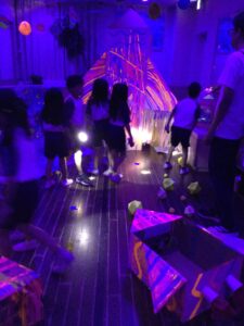 年長児だけの特別な行事、らいおんDAYがありました。4月から掲げてきた「おもちゃ」というテーマがどんどん広がり、当日までに様々な製作や遊びに取り組んできた子ども達です。数日前にはおもちゃ達から「夜のおもちゃパーティに招待するよ」という手紙が届き、らいおんDAYの行事に期待を持って過ごしていました。当日にはプラネタリウムに行ったり、お弁当や特別な夕食を食べたりして過ごしました。夜にはおもちゃパーティが開催され子ども達が作った作品がたくさん飾られていましたよ。中でもブラックライトの世界は本物の宇宙のようで大喜びでした。1日を通して様々なミッションに挑戦することを楽しみ、友だちとの絆が1日になりました。