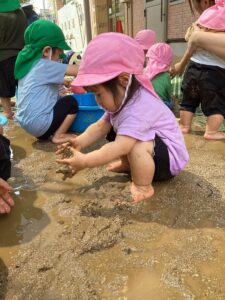 こりすのへや(0歳児)の子ども達は、初めて泥んこ遊びをしました。最初は感触に戸惑い泣いてしまう子どももいましたが、少しずつ泥に触れ不思議そうに掴んだ砂を見つめてみたり、水面を叩いて泥水が跳ねるのを楽しんだりする子どもたちの姿も見られました。これからも安全に配慮しながら水や泥の感触を全身で感じながら自然との触れ合いを深めていきたいと思います。