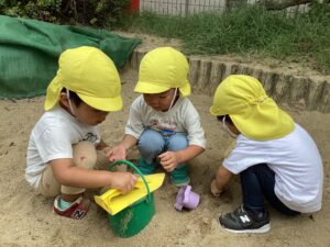 9月下旬から少しずつ涼しくなったことで、うさぎのへや(2歳児)の子ども達の大好きな園庭遊びができるようになりました。久しぶりに園庭で遊んだ子ども達の姿には、少し変化がありました。夏前に園庭で遊んでいた時は、それぞれが好きな遊びを黙々と楽しむ姿が多く見られていましたが、今では砂場でお友達と会話をしながら遊んだり、木製遊具ではスロープや階段ではなく少し難しいロープ側から登ったりと、子ども達の成長には驚きを隠せませんでした。これからもお友達との関わりを存分に楽しんだり、子ども達の長所を伸ばせるような遊びを工夫したりと、伸び伸び楽しめる機会をつくっていきたいと思います。