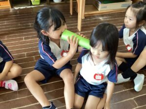 きりんのへや(4歳児)の子ども達は、伝言ゲームに挑戦しました。お題を正確に聞き取り、次の友だちに伝えることに始めは苦戦していました。聞き取れなかったり、伝わらなかったりするもどかしさを感じながらも、一生懸命伝え、伝えることができた際にはみんなで「やったー!」と大喜びしていました。これからも繰り返し遊んでいく中で、聞く力や伝える力を養っていくことができればと思います。