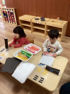 りすのへや(1歳児)は1月24日の土曜日に保育参観がありました。保育参観では、のりまきの製作をしました。のりまきの具材を選び、くるくる巻くことを楽しんでいました。完成すると作ったのりまきでごっこ遊びを楽しみ、嬉しそうに見せてくれる子ども達でした。