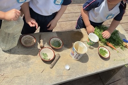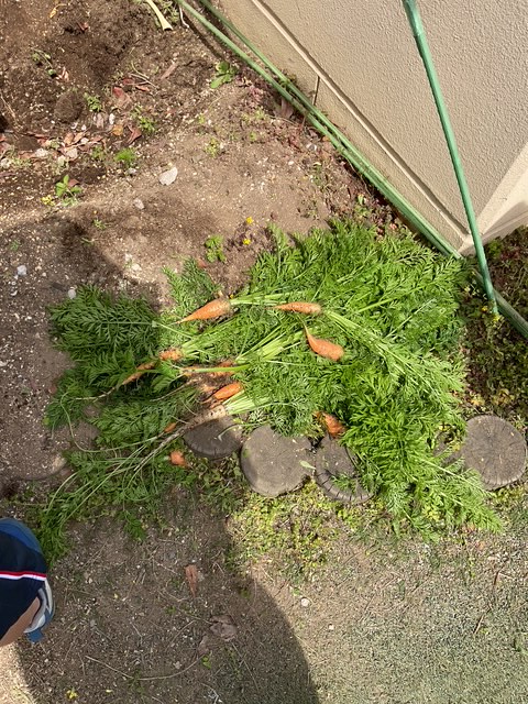 園庭遊び 2026/04/23 昨年のらいおんさんが冬に植えていたにんじんが大きく育っていたので、みんなで抜いてみました。 抜いてみると「わあーにんじんだ!」「これは白い!」など感じたことを口々に話していました。 抜いている時には、力加減が難しく…力を入れすぎてしりもちをついてしまう子もいました。 また、抜いたにんじんや園庭に生えている植物をすり鉢で擦ってみたり水に入れてみたりしながら楽しんでいました。