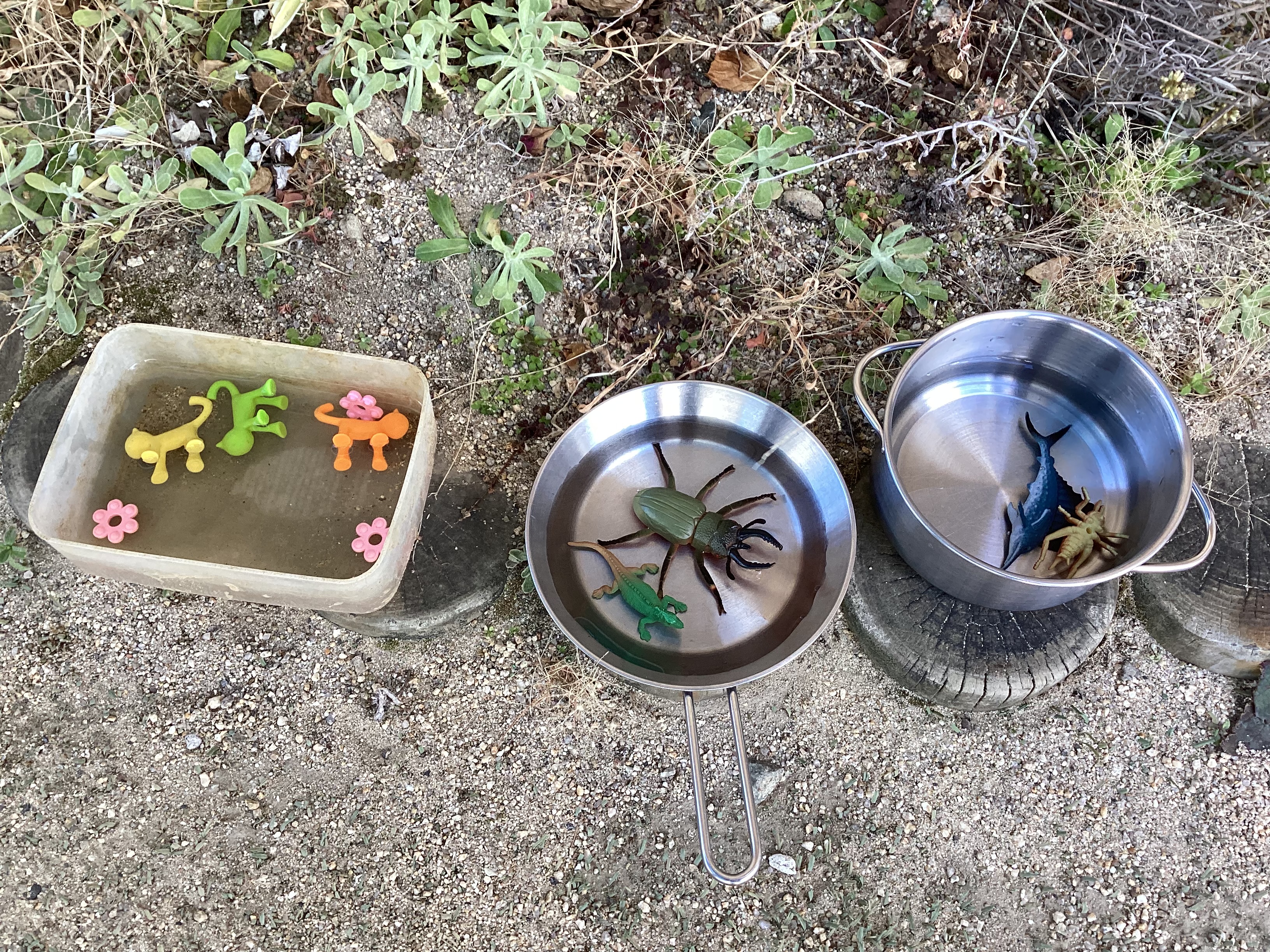 先日寒い日が続き、子ども達と保育者で氷ができるのではないかとなり、容器に水をはりました。子ども達は、様々な容器の中に昆虫や花の玩具を入れ、一晩屋上園庭に置いていました。