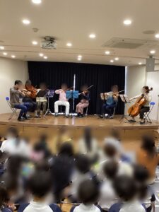 西宮チェンバーオーケストラの方に来ていただき、ミニコンサートをしていただきました。 知っている曲が流れると、一緒に歌ったり手拍子をしたりと思い思いに楽しんでいました。 生で演奏を聴いたり、本物の楽器を見ることが出来たりと…