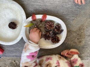 園庭もすっかり秋となりました。 葉っぱや松ぼっくりを園庭に置いていると子ども達が自分達で遊びを見つけて楽しんでいます。 落ち葉を上に投げて「わぁーすごい!」と大喜び! 木に登って「お猿さんみたい!ウッキッキー!」 ヤツデ…