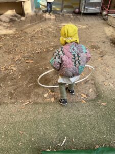 園庭に落ちているたくさんの落ち葉に興味を持った子ども達。 どうやったら集めることが出来るかを考え、近くにあったフラフープを持ってきて 一生懸命集めていました。 たくさん集まってくると「どうしようか?」とみんなで考えてみた…
