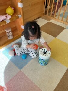 入園から半年が経ち、子ども達の成長が著しく感じます。 入園当初はゴロゴロしている子が歩けるようになったり、小さいものをつかんだりすることが出来るようになったりしています。 室内でも様々な玩具に興味を持って、触ってみたり挑…