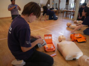 AEDも練習用を使い、実際にパッドを貼り付けて動かしてみます。