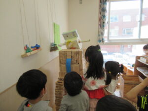 5歳児クラスのらいおん組では、絵本「ロボットカミィ」の世界を楽しんでいます。”たけしとようこ”が紙で作ったロボットカミィ。いたずらでわがままで泣き虫ですが力持ち。たけし達の通う幼稚園のもも組へ行き、一緒に遊んだりケンカをしたりしながら大騒ぎをおこす物語です。