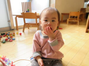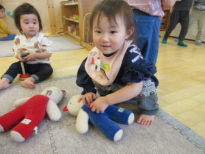 こりすぐみの子ども達は、入園当初からわらべうたに触れ、親しんできました。最初の頃は保育教諭と一対一で向かい合い、目と目を合わせて心を通わせる時間を楽しんでいました。これまで保育教諭と十分に触れ合い、喜びを感じてきたからこそ、わらべうたへの親しみや安心感が育まれ、友達やぬいぐるみとも行う姿が見られるようになってきています。繰り返すうちに歌や動きを覚え、最近では友達と向かい合って「はなさかん」「ちょつちょつあわわ」などのわらべうたを行い、笑い合ったり「いっぽんばしこちょこちょ」をして友だちと触れ合ったりと、わらべうたを通して友達との関わりが広がっています。友達だけでなく、ぬいぐるみともわらべうたをする可愛らしい様子も見られるようになっています。これからも様々なわらべうたを一緒に行いながら、言葉やリズムへの興味を引き出し、自分の気持ちや意思を動作や言葉で表す力を育てていきたいと思います。