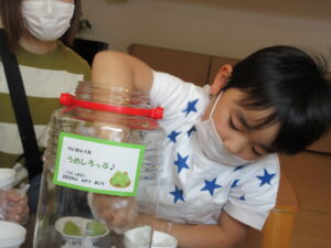 5歳児クラスでは、食育の活動として梅シロップ作りを行いました。絵本「はじめての梅しごと」を通して作り方を学んだ子ども達はとってもはりきっていました。