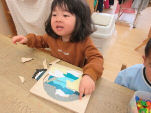ぱんだ組になってから新しい玩具が増え、パズルがレベルアップしました。以前は型はめや絵本を題材としたパズルでしたが、パーツが細かくなり最初の完成図を覚えていないと難しい内容です。初めは保育教諭と一緒にしていましたが、今では集中して自分の力だけで完成させる子ども達が増え、「先生できたよ~」と笑顔で教えてくれます。またお友達が「わからないよ~」という声に「どうしたの?これはねぇ~ここだよ」と教えてあげる姿が見られます。これからも一緒に楽しんでいきたいと思います。