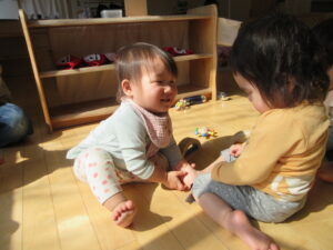こりすぐみの子ども達は、入園当初からわらべうたに触れ、親しんできました。最初の頃は保育教諭と一対一で向かい合い、目と目を合わせて心を通わせる時間を楽しんでいました。これまで保育教諭と十分に触れ合い、喜びを感じてきたか…