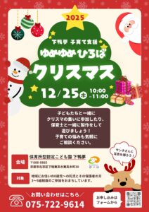 地域の保護者の方に向けて以下のような支援事業を実施します。 日 時 :12月25日(木) 10:00~11:00 場 所 :保育所型認定こども園 下鴨夢 (京都市バス「高木町」より徒歩3分) 対 象 :…