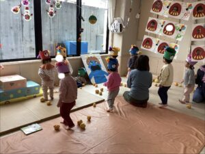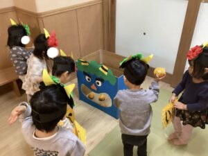 その後、乳児は鬼の的に向かって豆に見立てたボールを投げる豆まきを楽しみました。途中で本物の鬼が登場すると、怖くて涙を見せる子もいましたが、「鬼は外!」と勇気を出して豆を投げ、立ち向かう姿も見られました。
