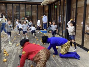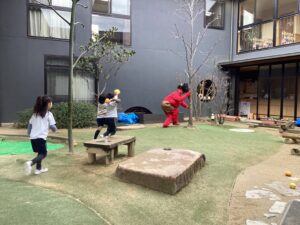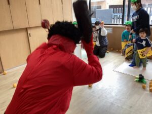 幼児も、鬼に果敢に立ち向かい、力いっぱい投げる姿があり、園内は活気に溢れていました。友だちと協力したり、柊鰯を手に自分から鬼に近づいて追い払おうとしたりと、頼もしい子どもたちの姿が印象的でした。
