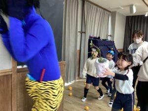 子どもたちはそれぞれ鬼に変身して参加し、「まめまき」のうたを歌ったり、節分にちなんだ絵本を見たりして、季節の行事に親しみました。