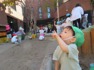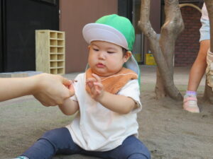 子どもたちは自然に触れて探索遊びを楽しんでいます。初めは保育教諭の抱っこのもとで園庭に行っていましたが、外遊びの準備をする中で園庭の方を指さして「早く行きたい」という思いを伝える姿が見られています。成長に合わせて歩行やハイハイが出来るようになってきた子は自分から砂場に向かい、保育教諭の真似をしてスコップで穴を掘ろうとしてみたり、落ちていた葉っぱを見つけると「ぱ、ぱ」と声を出して見つけたことを教えてくれたりもしていました。