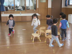 2歳児クラスは、簡単なルールのある遊びを楽しむ姿が見られるようになりました。ホール活動の中で様々な集団遊びをしており、現在は椅子取りゲームが盛り上がっています。