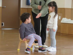 椅子に座ることができなかった悔しさや、最後の1つの椅子に座ることができた喜び等、様々な感情を表現する場面も増えていますが、遊びを通して感じる気持ちの共有を大切にしながら、友だちと一緒に同じ遊びをすることが楽しいと感じる時間になるよう、保育教諭も関わっていきたいと思います。