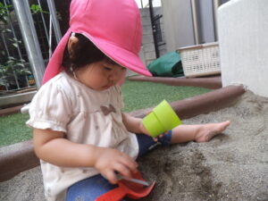 夏の暑さも和らぎ、季節の移り変わりを感じる時期になりました。涼しい日は、園庭で砂遊びを楽しんでいます。最初は砂の感触に消極的な子どもが多かったのですが、慣れてくるとスプーンで砂を掘り起こしたり、カップの中に砂を入れたり…