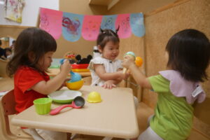 進級から五か月ほどたち、保育士だけでなくお友だちの名前を覚え、関わる姿も見られている一歳児の子どもたちの様子があります。そんな姿から、もっと関わりを楽しんでほしいと思い、『アイスクリーム屋さんごっこ』を始めました。 …