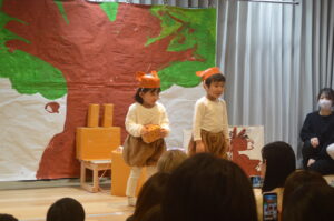 12月13日に2歳児から5歳児対象の生活発表会を行いました。 各クラスの劇の内容は子どもたちが好きな絵本を題材にし、役も自分たちで決めて当日に向けて日中や夕方の時間に練習をしてきました。 練習の時とは違い、当日はお母さん…
