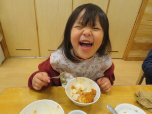 12月24日は子どもたちが待ちに待ったクリスマス会でした。今年のクリスマスメニューは、ミートドリア、リースサラダ、コンソメスープ。おやつはサンタプリンでした。 ミートドリアはチーズとにんじん、コーン、グリンピースを使…