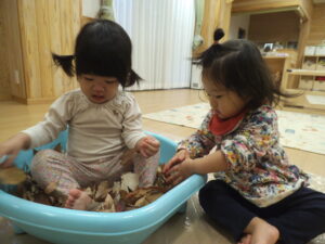先日、近隣の公園に散歩に行き、遊具で遊びながら落ち葉拾いもしました。 室内遊びの日に、みんなで拾ってきた落ち葉を使って落ち葉遊びをしました。葉っぱを見つけると、大事に持ちながら「はっぱ」と言いながら見せてく…