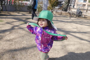 寒い日が続いていますが、元気いっぱいに駆け回って遊んでいます。 たくさん戸外に出て遊ぶ機会を増やしてきたことで、身体能力も高くなり、色々なことができるようになってきました。 ラバーリングを持っていき、繋げて置いて…