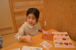 その中から多数決で“アイス屋さん”“宝石屋さん”“駄菓子屋さん”“おもちゃ屋さん”に決まり、日々準備を進めています。「作ったもので遊びたい。」という姿もあったので、お部屋の環境にも作ったものを出すと、「いらっしゃいませ!何の味にしますか?」「いちご味と~レモン味で」等とお店屋さんとお客さんの役になりきりながら〇〇屋さんを楽しんでいます。お店屋さんごっこの準備が進むにつれて、他クラスの友だちや他園のお友だちがお客さんとして来てくれることを楽しみにする姿も増えてきたので、当日までの活動の中で「どうしたら喜んでくれるかな?」「お店屋さんはどうやってお話しているかな?」と子どもたちと一緒に考え、作り上げていく時間を大切にしていきたいと思います。