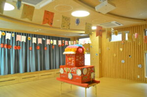 8月の夏祭りに向けて、0歳児から5歳児までの全クラスに野菜スタンプで飾りを作りました。