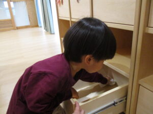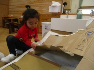 室内遊び(2歳児) 2026/03/25 ほがらかな陽気に春が近づいてきています。 新年度に向けて保育室の引っ越しを行いました。 まずは2歳児のへやの片付けです。 たくさん遊んだ段ボールのドクターイエローや家を解体しました。 小さく破いたり、段ボールと画用紙をはがしたり、と身体より大きい段ボールを全身で解体していました。 「1年間ありがとう」と言いながら使ったロッカーを拭いて幼児のロッカーに荷物を移動しました。 新年度まであと1週間。 新しい生活リズムを少しずつ覚えてきている子どもたちです。 まだまだいっぱい遊ぼうね!