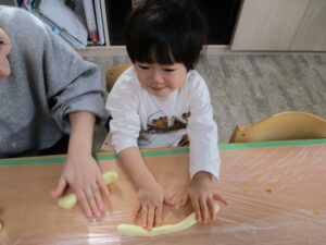 伸びる粘土に触れて遊びました。小麦粉粘土や片栗粉粘土とはまた違った感触に興味津々。子どもたちも大喜びで「きもちい~」と夢中で触っていました。保育者と一緒に持って、長く伸ばしたり丸めたりして楽しんでいました。